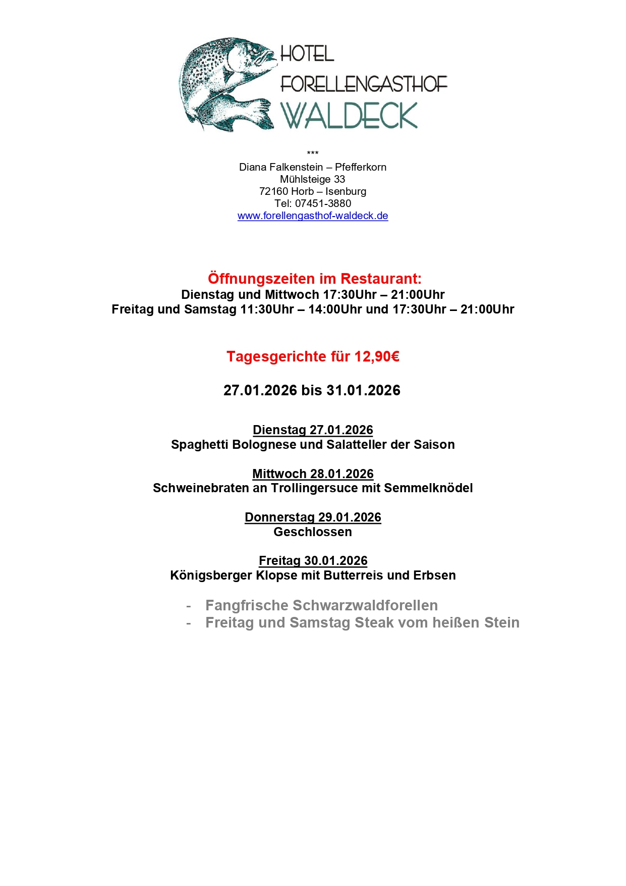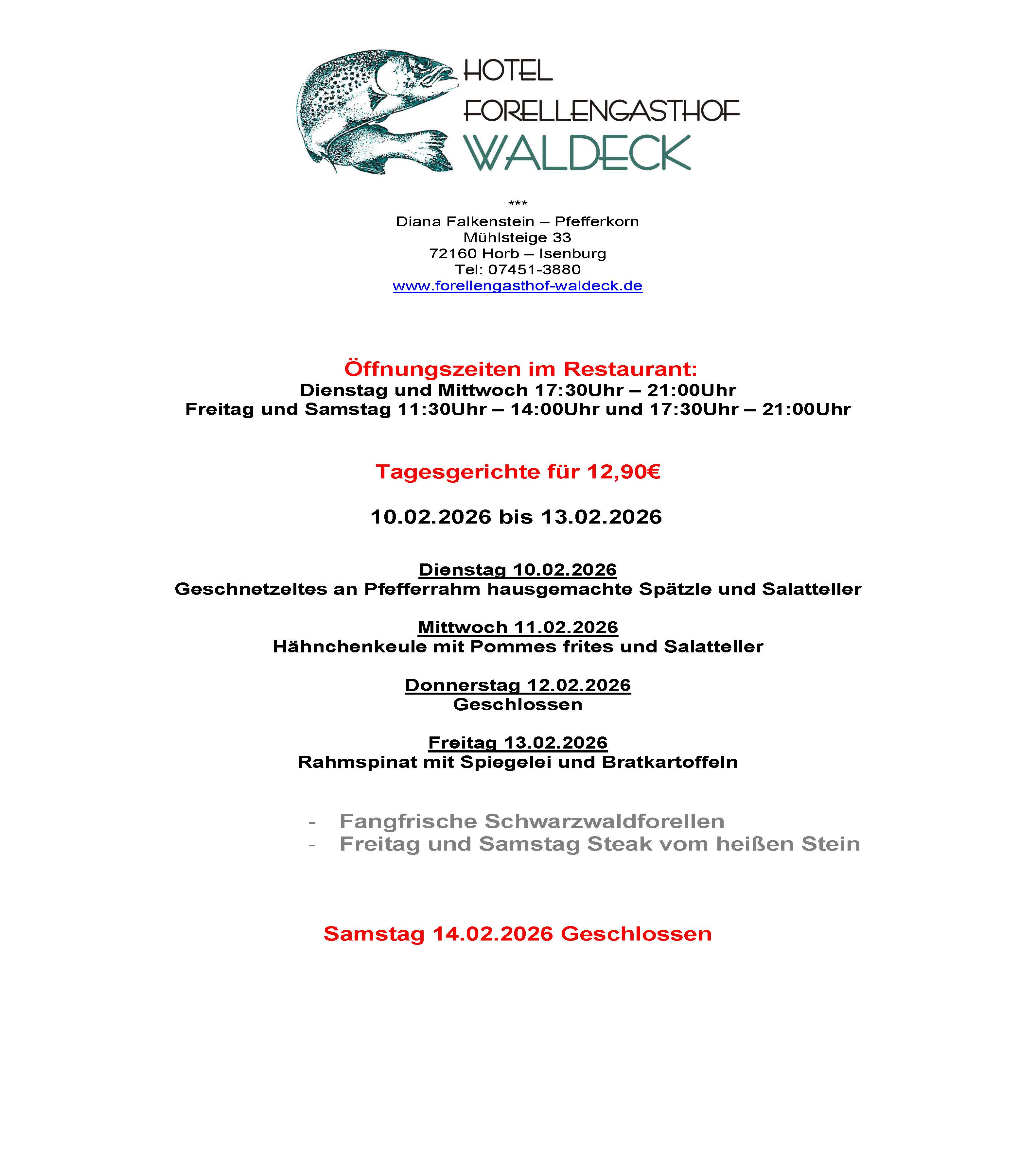 Rufen Sie uns an, um einen Tisch im Hotel Forellengasthof Waldeck in 72160 Horb-Isenburg zu reservieren! Wir freuen uns auf Ihren Besuch!